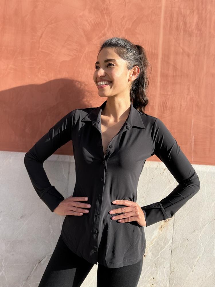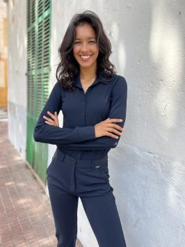 Deze kreukvrije blouse van D'ETOILES CASIOPÉ is een echte musthave die eigenlijk niet mag ontbreken in je garderobe. Deze blouse heeft een sexy snit en sluit met knopen.  De getailleerde vorm van deze blouse accenturen de vrouwelijke vormen. De mouwinzet is gedraaid waardoor armen optisch extra slank zijn. PETITE is gemaakt van Italiaanse classic traveljersey. Deze kwaliteit is strijkvrij, kreukvrij, ademend, sneldrogend, kleurvast en duurzaam. Bestel je eigen maat, vanaf cupmaat D adviseren wij een maat groter te bestellen. Nuit een diep donker blauwe tint.